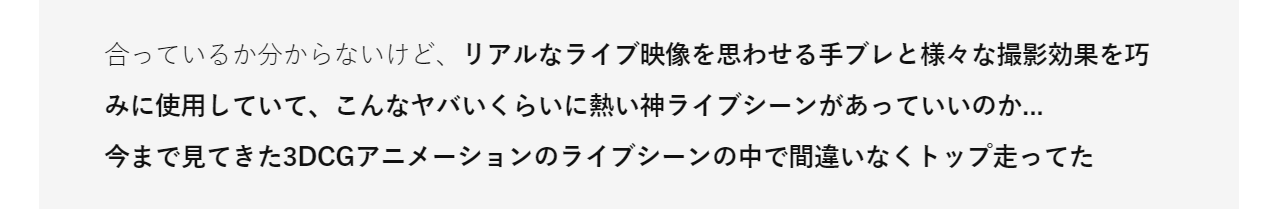 テレビ放送時と全く同じ感想、3DCGアニメーションでのライブシーンにおける最高到達地点だと思う