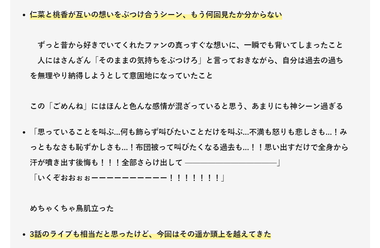- 仁菜と桃香さんが仁菜部屋で鍋食ってるシーン、桃香さんが仁菜の事情に踏み込んでいかなかったのがめちゃくちゃ桃香さんらしくて深いなと思った(という浅い感想)